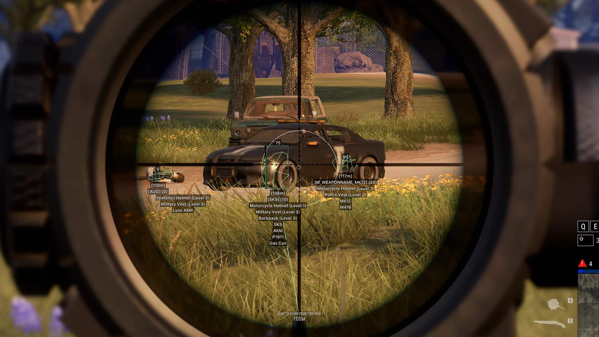 World ESP is responsible for displaying vehicles, airdrops, player corpses, and grenades. For vehicles, you can see their durability and fuel level, while for airdrops and crates you can view their contents. Showing distances and object names helps you navigate the map quickly and make tactical decisions.