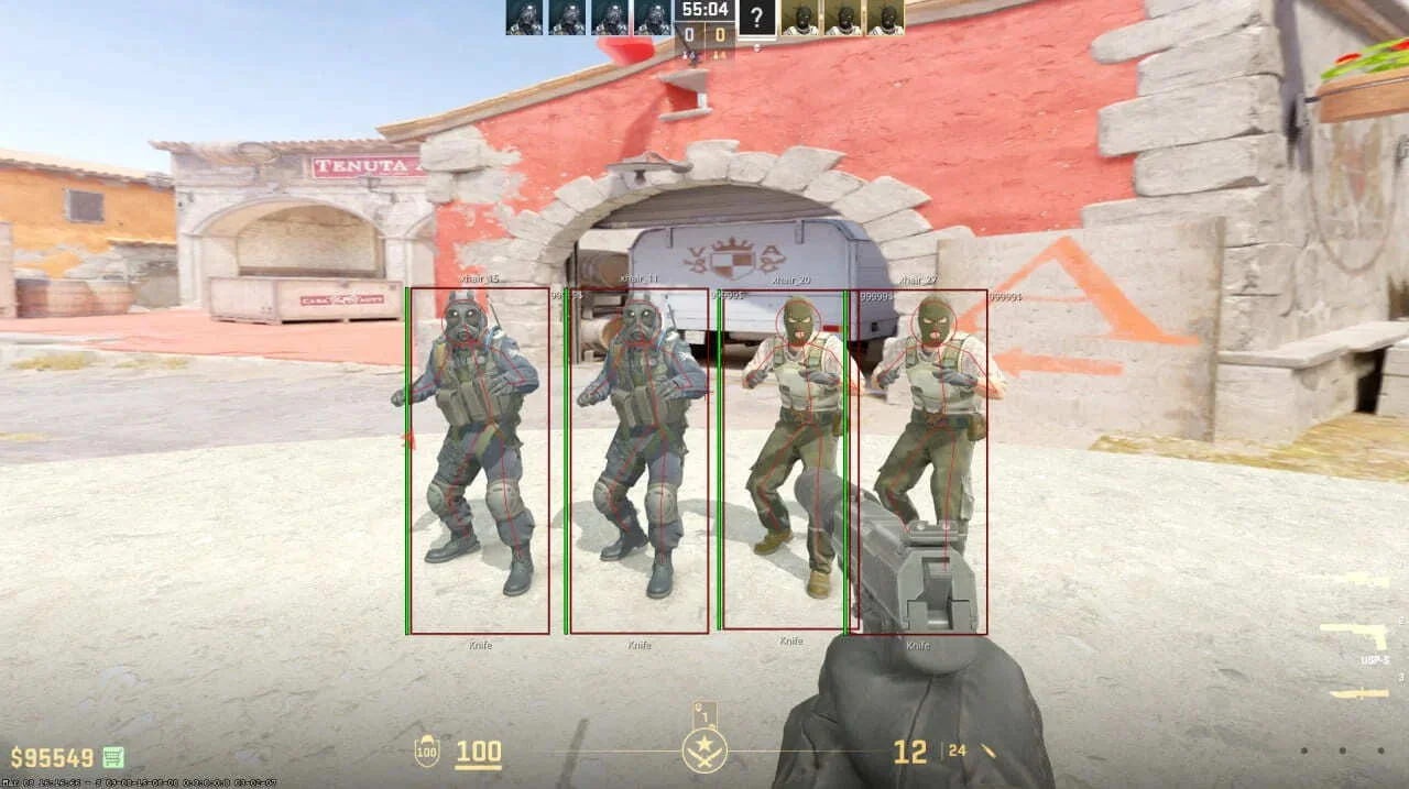 ESP отображает игроков с помощью боксов, скелетов, линий, стрелок за экраном и чамсов. Поддерживается подсветка видимых и скрытых целей разными цветами, отображение здоровья, оружия и никнеймов.
